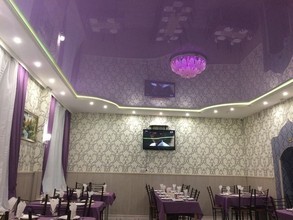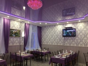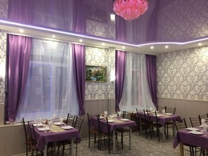 Залы кафе «Пионерский» – чистые и аккуратные. Окна украшены лиловыми портьерами. Отдельного внимания заслуживает натяжной пололок – он тоже приятного лилового оттенка, а благодаря глянцевому покрытию, в нем отражается весь зал, что позволяет визуально увеличивать и вытягивать пространство. Также в кафе «Пионерский» есть танцпол, где можно от души потанцевать под приятную музыку. Последнее развлечение придется весьма кстати, если Вы отдадите предпочтение кафе для реализации корпоратива.
